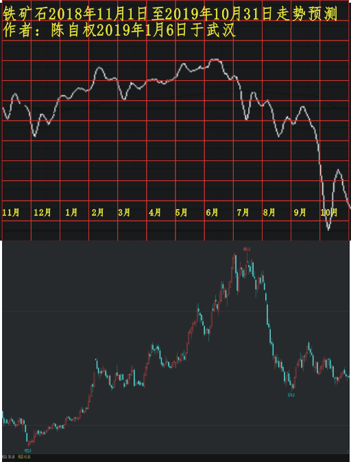 第二张:2019年1月6日研究绘制并发布在易数与商战网黑色栏目的铁矿石2018年11月1日至2019年10月31日走势研究与实际走势对照如下: