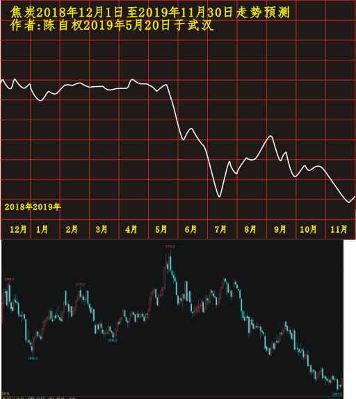 第二张2019年5月20日研究绘制的焦炭2018年12月1日至2019年11月30日走势研究与实际走势对比如下: