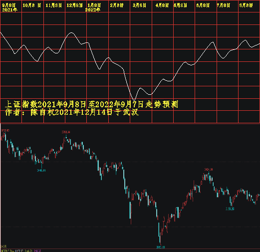 第一张是2021年12月14日研究绘制,主要表述了2022年度第一季度是跌的态势。2021年12月14日研究绘制并发布在易数与商战网证券指数研究栏目的上证指数2021年9月8日至2022年9月7日走势研究与实际走势对比如下:
