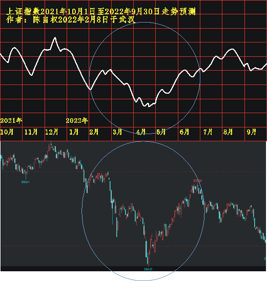 第二张研究图是2022年2月8日研究绘制,主要表述的一季度继续跌至4月后再起来。2022年2月8日研究绘制并发布在易数与商战网证券研究栏目的上证指数2021年10月1日至2022年9月30日走势研究与实际走势对比如下: