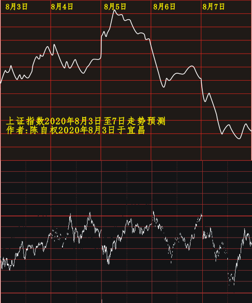 2020年8月3日研究绘制并发布在易数与商战网上证指数栏目(会员区)的上证指数2020年8月3日至7日走势研究与实际走势对比如下: