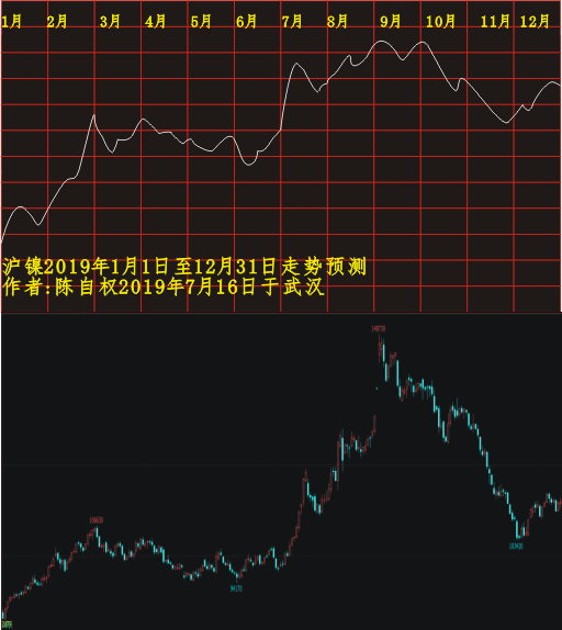 2019年7月16日研究绘制并发布在易数与商战网有色栏目的沪镍2019年1月1日至12月31日走势研究与实际走势对比如下: