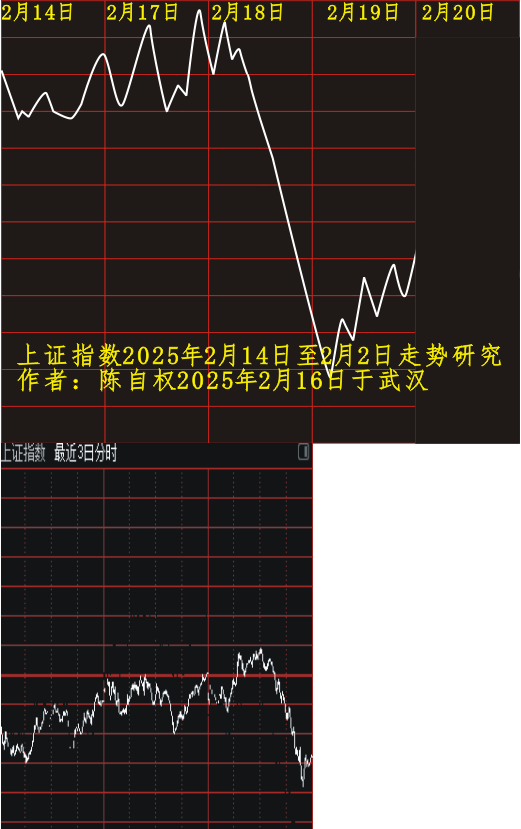 2025年2月16日研究绘制并发布在易数与商战网证劵预测栏目的上证指数2025年2月14日至2月20日走势研究与实际走势对比如下:
